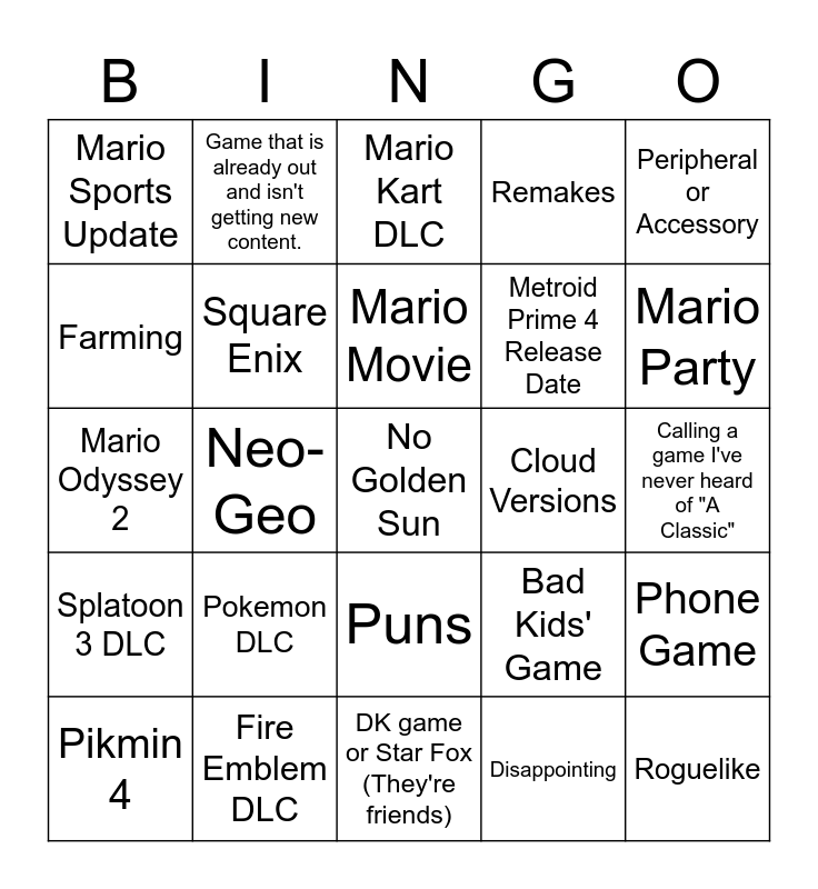 This bingo card has a free space and 24 words: Pokemon DLC, Fire Emblem DLC, Mario Movie, Pikmin 4, Peripheral or Accessory, Mario Sports Update, Farming, Game that is already out and isn't getting new content., Cloud Versions, Puns, Metroid Prime 4 Release Date, Mario Odyssey 2, Bad Kids' Game, Phone Game, Square Enix, Disappointing, Calling a game I've never heard of "A Classic", Mario Kart DLC, Mario Party, Neo-Geo, Roguelike, Splatoon 3 DLC, Remakes and DK game or Star Fox (They're friends).