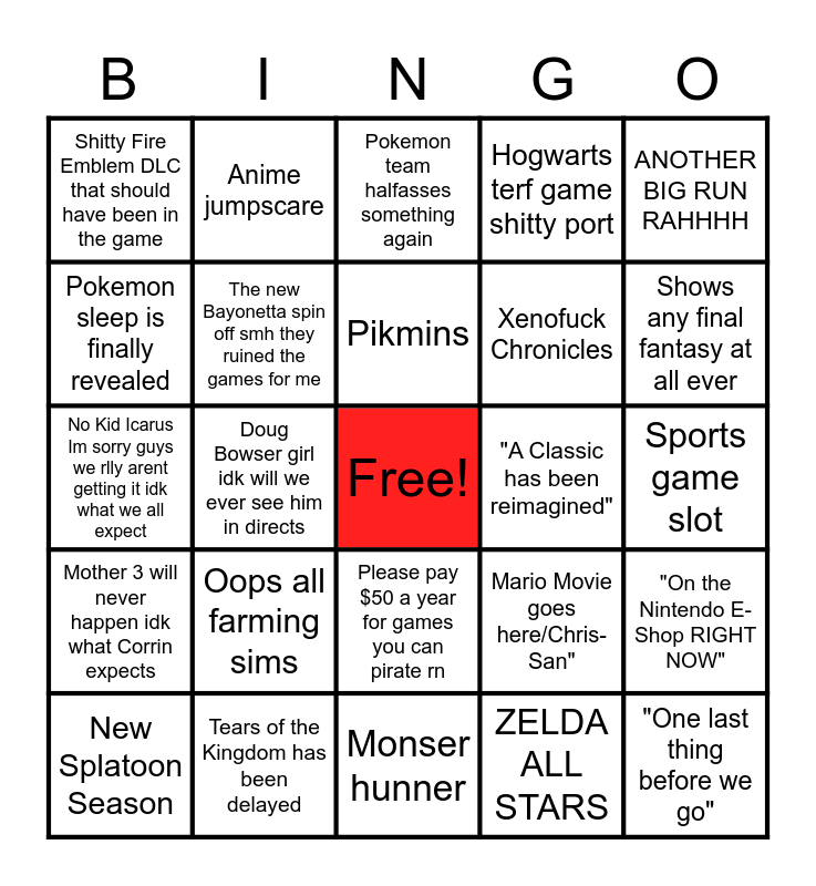 This bingo card has a free space and 24 words: Oops all farming sims, Tears of the Kingdom has been delayed, Pikmins, New Splatoon Season, ANOTHER BIG RUN RAHHHH, Shitty Fire Emblem DLC that should have been in the game, Pokemon sleep is finally revealed, Anime jumpscare, "A Classic has been reimagined", Please pay $50 a year for games you can pirate rn, Xenofuck Chronicles, No Kid Icarus Im sorry guys we rlly arent getting it idk what we all expect, Mario Movie goes here/Chris-San", "On the Nintendo E-Shop RIGHT NOW", The new Bayonetta spin off smh they ruined the games for me, ZELDA ALL STARS, Sports game slot, Pokemon team halfasses something again, Shows any final fantasy at all ever, Doug Bowser girl idk will we ever see him in directs, "One last thing before we go", Mother 3 will never happen idk what Corrin expects, Hogwarts terf game shitty port and Monser hunner.
