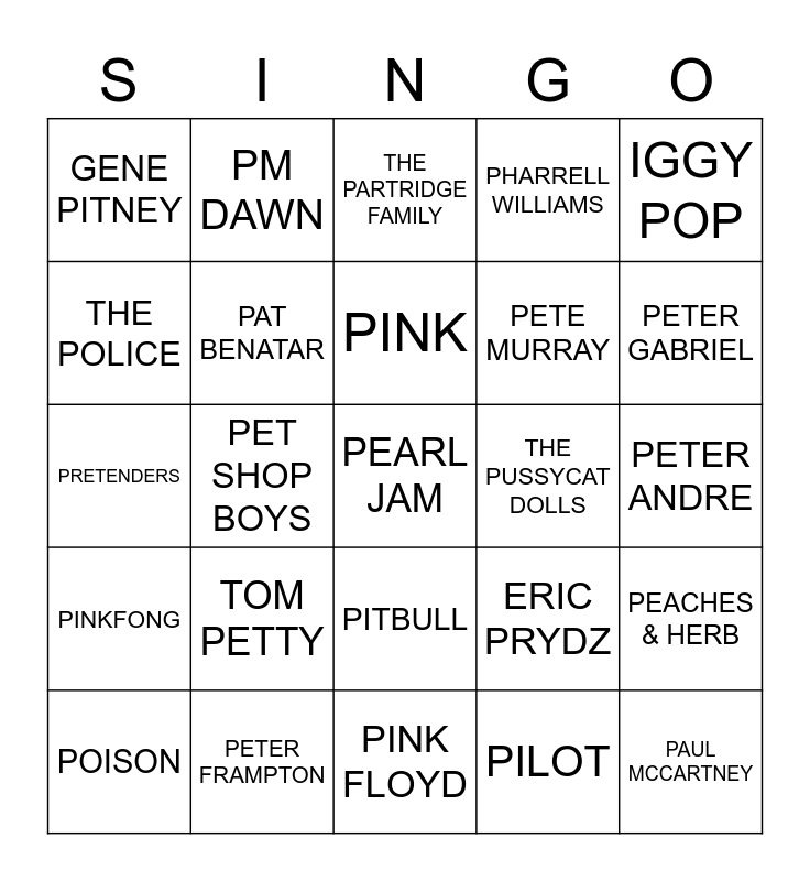 This bingo card has 25 words: TOM PETTY, PINK FLOYD, PINK, POISON, IGGY POP, GENE PITNEY, THE POLICE, PM DAWN, THE PUSSYCAT DOLLS, PITBULL, PETE MURRAY, PRETENDERS, ERIC PRYDZ, PEACHES & HERB, PAT BENATAR, PAUL MCCARTNEY, PETER ANDRE, THE PARTRIDGE FAMILY, PETER GABRIEL, PET SHOP BOYS, PEARL JAM, PETER FRAMPTON, PINKFONG, PHARRELL WILLIAMS and PILOT.