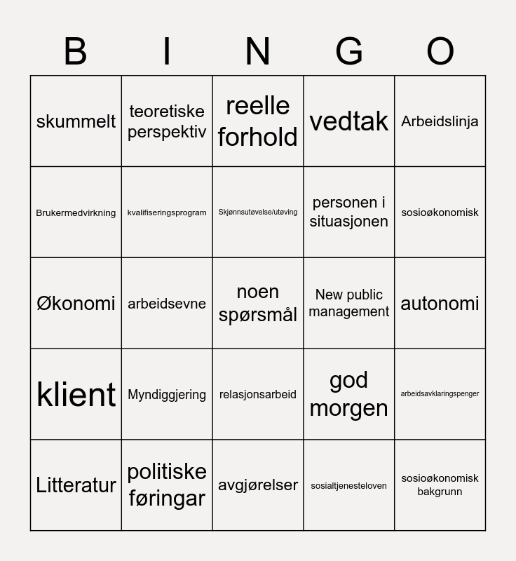 This bingo card has a free space and 24 words: Myndiggjering, politiske føringar, Skjønnsutøvelse/utøving, Litteratur, Arbeidslinja, skummelt, Brukermedvirkning, teoretiske perspektiv, New public management, relasjonsarbeid, personen i situasjonen, Økonomi, god morgen, arbeidsavklaringspenger, kvalifiseringsprogram, sosialtjenesteloven, autonomi, reelle forhold, sosioøkonomisk, arbeidsevne, sosioøkonomisk bakgrunn, klient, vedtak and avgjørelser.