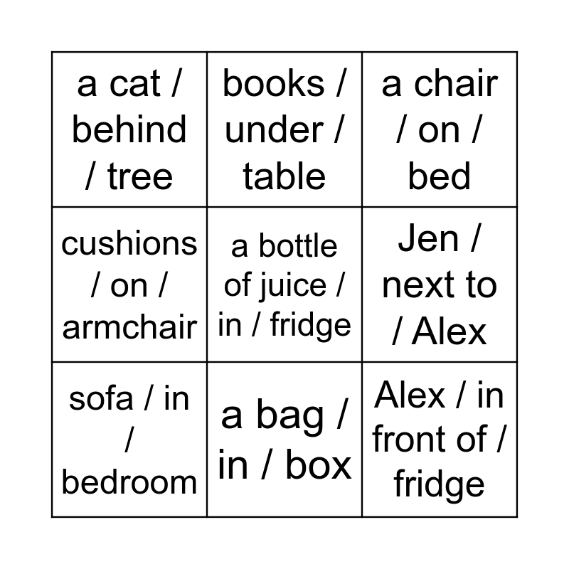 This bingo card has 12 words: 2 phones / on / table, Alex / in front of / fridge, a bottle of juice / in / fridge, Jen / next to / Alex, books / under / table, a chair / on / bed, a bag / in / box, T-shirts / in / wardrobe, a cat / behind / tree, cushions / on / armchair, sofa / in / bedroom and a dog / behind / door.