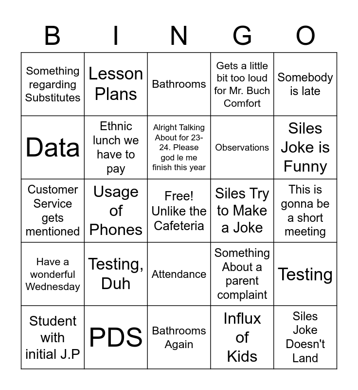 This bingo card has a free space and 24 words: Testing, Duh, PDS, Alright Talking About for 23-24. Please god le me finish this year, Student with initial J.P, Somebody is late, Something regarding Substitutes, Data, Lesson Plans, Siles Try to Make a Joke, Attendance, Observations, Customer Service gets mentioned, Something About a parent complaint, Testing, Ethnic lunch we have to pay, Influx of Kids, This is gonna be a short meeting, Bathrooms, Siles Joke is Funny, Usage of Phones, Siles Joke Doesn't Land, Have a wonderful Wednesday, Gets a little bit too loud for Mr. Buch Comfort and Bathrooms Again.
