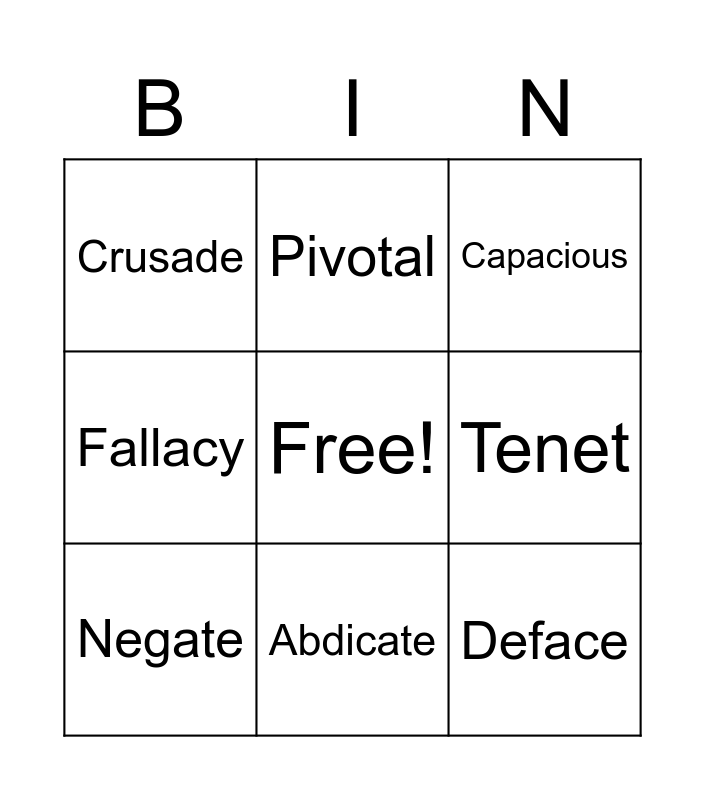 This bingo card has a free space and 10 words: Abdicate, Capacious, Crusade, Deface, Fallacy, Negate, Pivotal, Recipient, Tenet and Ungainly.