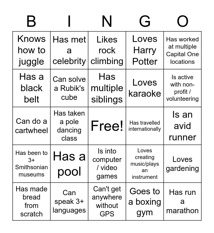 This bingo card has a free space and 50 words: Has a dog, Has run a marathon, Has been in a flash mob, Can't get anywhere without GPS, Has a pool, Has made a game, Has met a celebrity, Loves rollerblading, Has a black belt, Has lived in multiple countries besides the U.S.for an extended period, Can solve a Rubik's cube, Loves Harry Potter, Loves gardening, Loves creating music/plays an instrument, Loves film / TV shows, Is a foodie, Has multiple siblings, Has travelled internationally, Not a chocolate fan, Has worked at multiple Capital One locations, Has taken a pole dancing class, Goes to a boxing gym, Knows how to juggle, Loves karaoke, Is a car and truck fan, Plays volleyball, Is active with non-profit / volunteering, Has been / Is a teacher, Likes rock climbing, Is into computer / video games, Is a yogi, Loves Studio Ghibli movies, Has lived in more than three U.S. states, Plays Cricket, Can speak 3+ languages, Can do a pull-up, Listens to podcasts, Knows their Myers-Brigg personality type, Is a good cook, Is an avid runner, Has two letters in common with your first names, Has made sushi at home, Prefers winter over summer, Same birth month as you, Has made bread from scratch, Can do a cartwheel, Loves fun / funny socks, Has a tattoo, Has been to 3+ Smithsonian museums and Wakes up before 6am everyday.