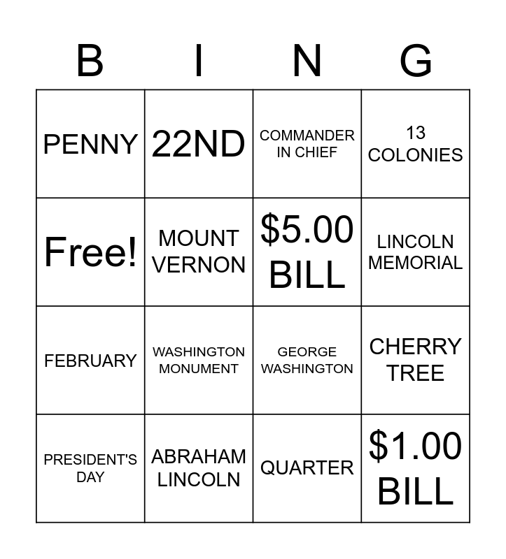 This bingo card has 16 words: ABRAHAM LINCOLN, CHERRY TREE, COMMANDER IN CHIEF, PENNY, FEBRUARY, 22ND, GEORGE WASHINGTON, QUARTER, Free!, MOUNT VERNON, PRESIDENT'S DAY, 13 COLONIES, WASHINGTON MONUMENT, LINCOLN MEMORIAL, $5.00 BILL and $1.00 BILL.
