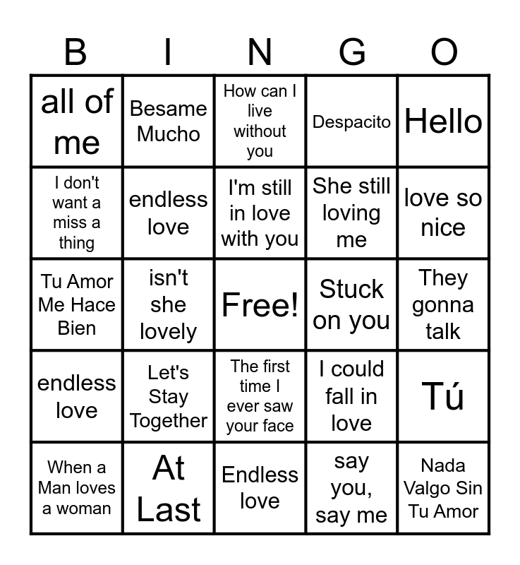 This bingo card has a free space and 24 words: Let's Stay Together, At Last, I'm still in love with you, When a Man loves a woman, Hello, all of me, I don't want a miss a thing, Besame Mucho, Stuck on you, The first time I ever saw your face, She still loving me, Tu Amor Me Hace Bien, I could fall in love, Tú, endless love, say you, say me, They gonna talk, How can I live without you, love so nice, isn't she lovely, Nada Valgo Sin Tu Amor, endless love, Despacito and Endless love.