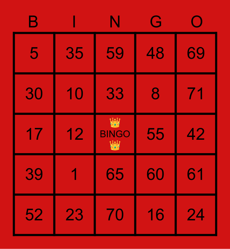 This bingo card has a free space and 24 words: 1, 23, 33, 52, 69, 5, 30, 35, 55, 65, 8, 17, 60, 61, 10, 16, 42, 59, 71, 12, 24, 39, 48 and 70.