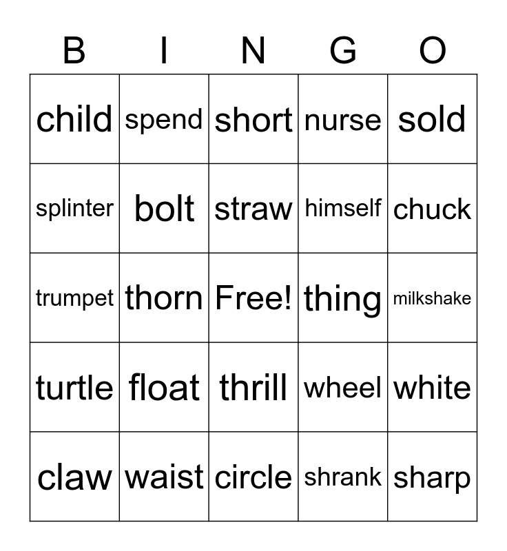 This bingo card has a free space and 24 words: float, waist, straw, claw, sold, child, splinter, spend, thing, thrill, himself, trumpet, wheel, white, bolt, shrank, milkshake, short, chuck, thorn, sharp, turtle, nurse and circle.