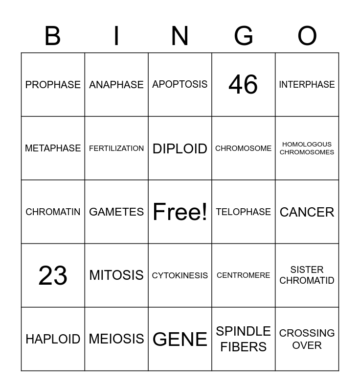 This bingo card has a free space and 24 words: MITOSIS, MEIOSIS, DIPLOID, HAPLOID, INTERPHASE, PROPHASE, METAPHASE, ANAPHASE, TELOPHASE, CYTOKINESIS, CHROMOSOME, CHROMATIN, CENTROMERE, SISTER CHROMATID, FERTILIZATION, SPINDLE FIBERS, CANCER, APOPTOSIS, HOMOLOGOUS CHROMOSOMES, GAMETES, CROSSING OVER, 23, 46 and GENE.