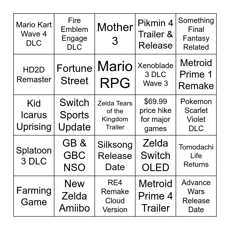 This bingo card has a free space and 24 words: GB & GBC NSO, New Zelda Amiibo, Mario RPG, Farming Game, Something Final Fantasy Related, Mario Kart Wave 4 DLC, HD2D Remaster, Fire Emblem Engage DLC, $69.99 price hike for major games, Silksong Release Date, Xenoblade 3 DLC Wave 3, Kid Icarus Uprising, Zelda Switch OLED, Tomodachi Life Returns, Fortune Street, Metroid Prime 4 Trailer, Pokemon Scarlet Violet DLC, Mother 3, Metroid Prime 1 Remake, Switch Sports Update, Advance Wars Release Date, Splatoon 3 DLC, Pikmin 4 Trailer & Release and RE4 Remake Cloud Version.