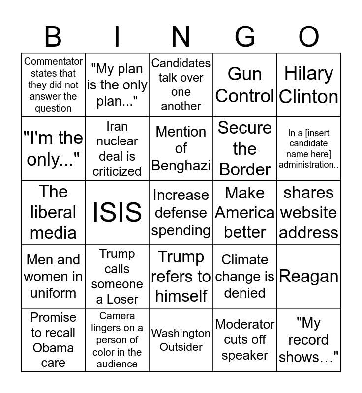 This bingo card has a free space and 24 words: Trump calls someone a Loser, Camera lingers on a person of color in the audience, Mention of Benghazi, Promise to recall Obama care, Hilary Clinton, Commentator states that they did not answer the question, "I'm the only...", "My plan is the only plan...", Make America better, Trump refers to himself, Secure the Border, The liberal media, Climate change is denied, Reagan, Iran nuclear deal is criticized, Moderator cuts off speaker, shares website address, Candidates talk over one another, In a [insert candidate name here] administration.., ISIS, "My record shows…", Men and women in uniform, Gun Control and Washington Outsider.