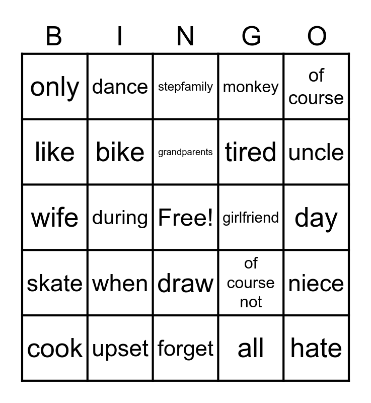 This bingo card has a free space and 100 words: card, gift, day, neighbour, stranger, sugar, sweet, and so are you, inside, proud, sad, confused, scared, upset, worried, surprised, tired, happy, angry, excited, shy, feel, relatives, what, boyfriend, girlfriend, of course, of course not, I don’t know, who, during, only, a lot, need, all, grandparents, niece, nephew, grandchildren, daughter, son, husband, wife, aunt, uncle, stepfamily, family in-law, mean, always, forget, do my best, sibling, look like, smell, lucky, main character, pig, fish, bunny, monkey, turtle, bird, fox, cow, bear, wolf, moose, hide and seek, beautiful, what happened, where, when, why, how many, which, because, enjoy, like, love, do not like, can’t stand, hate, paint, draw, watch TV, dance, read, listen to music, shop, skate, play video games, meet friends, spend time with friends, cook, bike, swim, go to the movies, play music, sing and play ball.
