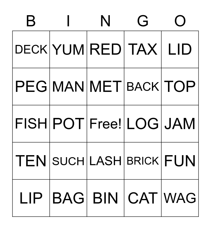 This bingo card has a free space and 32 words: CAT, SAD, POT, RUG, TEN, MAN, LID, FUN, YUM, HUT, MET, RED, MAP, HIT, LOG, BIG, LIP, FISH, LASH, SUCH, BRICK, MUSH, JAM, BAG, WAG, TAX, BACK, PEG, DECK, BIN, FIN and TOP.