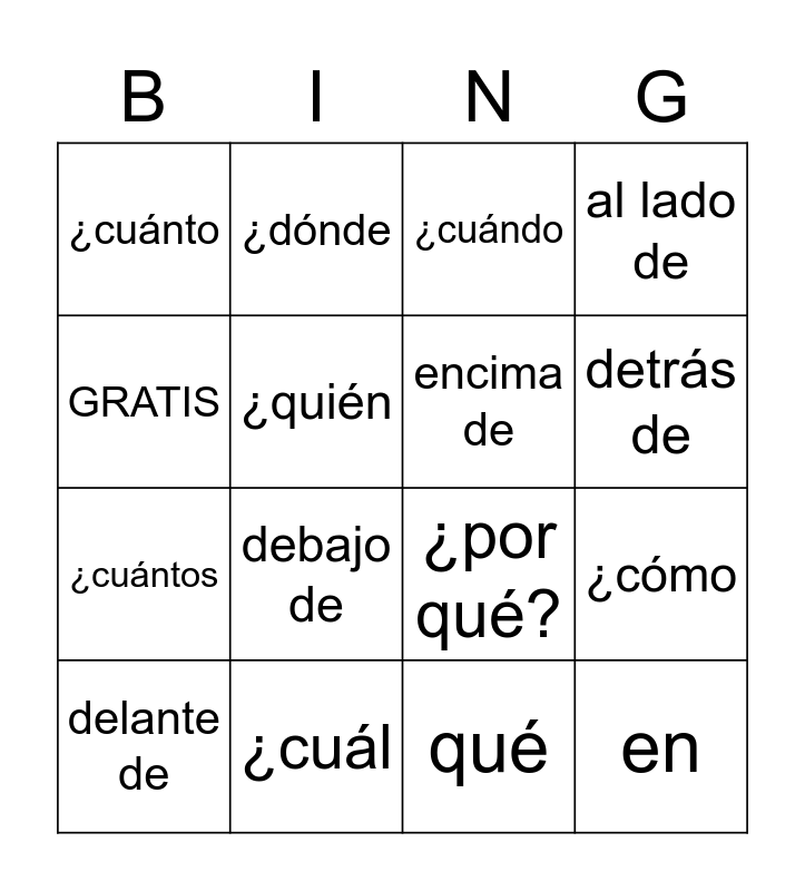 This bingo card has 16 words: ¿cuál, ¿cómo, ¿cuándo, ¿cuánto, ¿cuántos, ¿dónde, ¿por qué?, qué, GRATIS, ¿quién, delante de, al lado de, debajo de, detrás de, encima de and en.