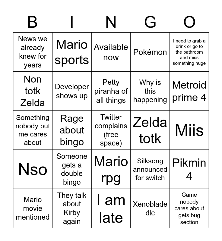 This bingo card has a free space and 24 words: Someone gets a double bingo, They talk about Kirby again, Petty piranha of all things, Mario movie mentioned, I need to grab a drink or go to the bathroom and miss something huge, News we already knew for years, Non totk Zelda, Mario sports, Zelda totk, Mario rpg, Why is this happening, Something nobody but me cares about, Silksong announced for switch, Pikmin 4, Developer shows up, Xenoblade dlc, Miis, Available now, Metroid prime 4, Rage about bingo, Game nobody cares about gets bug section, Nso, Pokémon and I am late.
