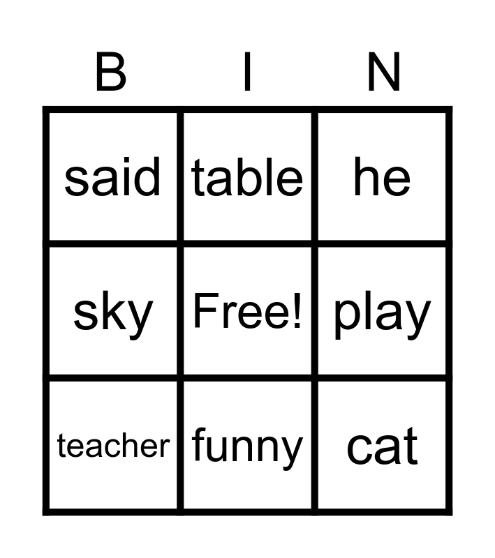 This bingo card has a free space and 18 words: long, flower, he, said, black, sky, on, table, funny, up, bread, cat, school, play, teacher, run, it and purple.