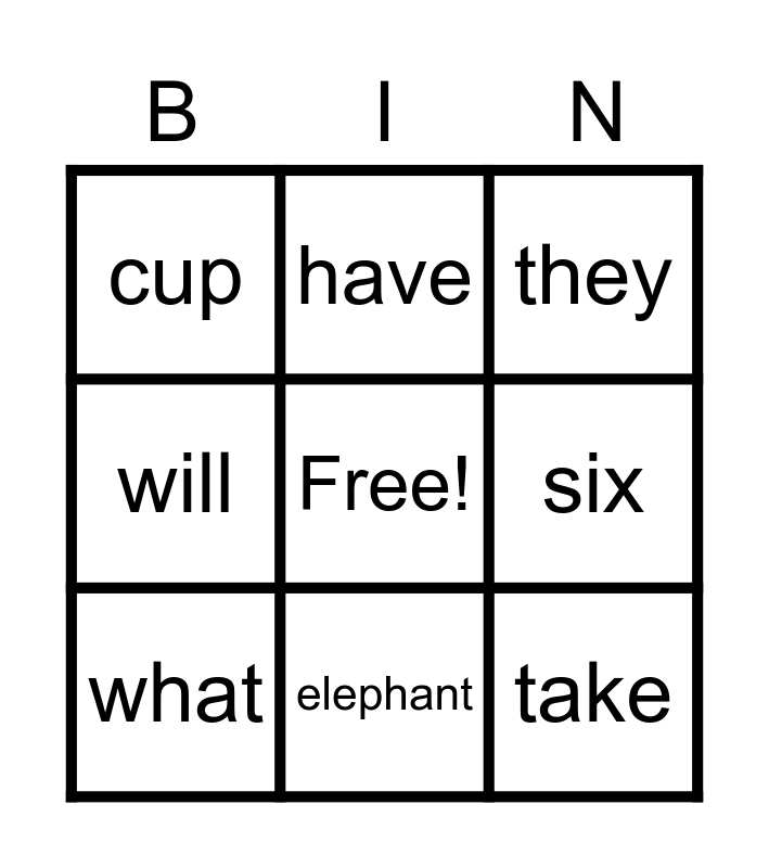 This bingo card has a free space and 18 words: drink, at, they, cup, fast, will, man, have, elephant, slow, scissors, take, good, six, what, for, zoo and milk.