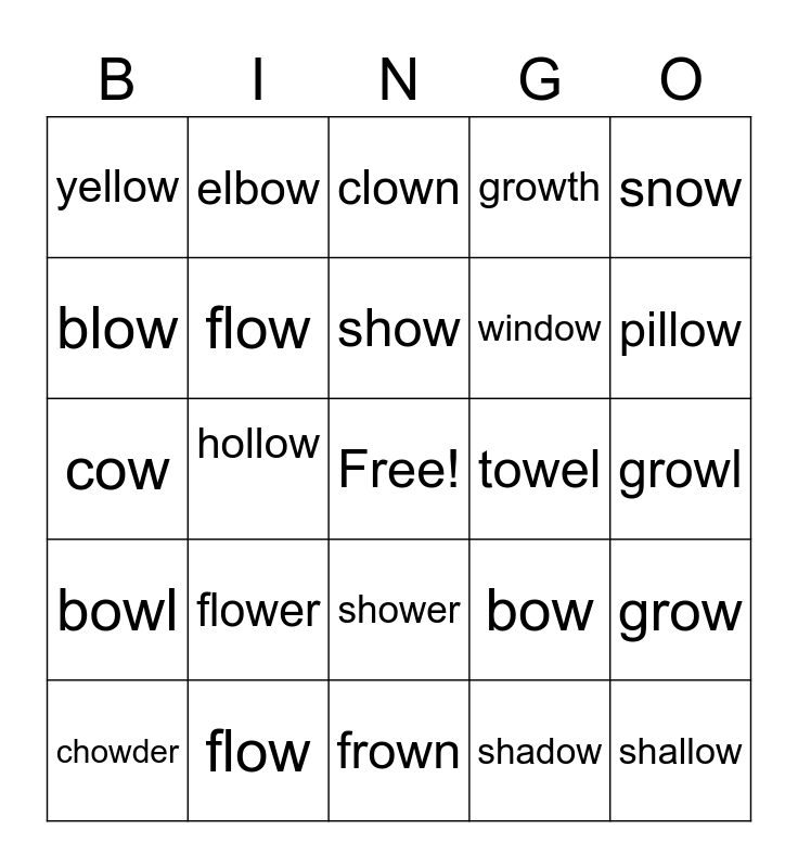 This bingo card has a free space and 25 words: flower, frown, show, chowder, snow, yellow, blow, elbow, towel, shower, window, cow, bow, grow, flow, down, growl, clown, pillow, hollow, shallow, flow, bowl, growth and shadow.