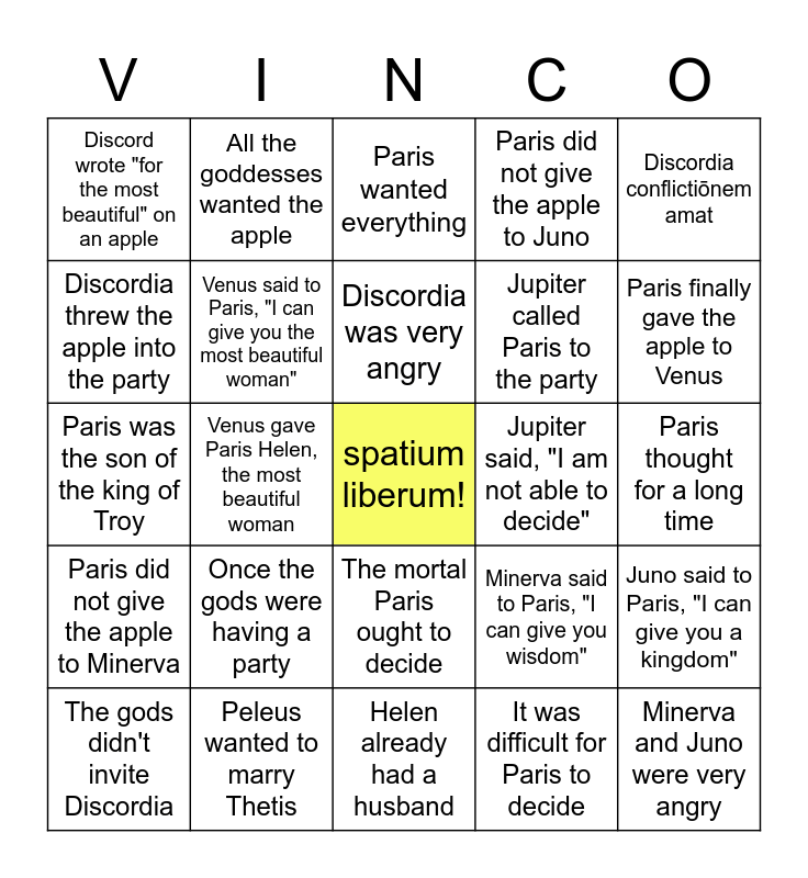 This bingo card has a free space and 24 words: Once the gods were having a party, Peleus wanted to marry Thetis, Discordia was very angry, The gods didn't invite Discordia, Discordia conflictiōnem amat, Discord wrote "for the most beautiful" on an apple, Discordia threw the apple into the party, All the goddesses wanted the apple, Jupiter said, "I am not able to decide", The mortal Paris ought to decide, Jupiter called Paris to the party, Paris was the son of the king of Troy, Minerva said to Paris, "I can give you wisdom", Juno said to Paris, "I can give you a kingdom", Venus said to Paris, "I can give you the most beautiful woman", It was difficult for Paris to decide, Paris thought for a long time, Paris wanted everything, Paris finally gave the apple to Venus, Venus gave Paris Helen, the most beautiful woman, Minerva and Juno were very angry, Paris did not give the apple to Minerva, Paris did not give the apple to Juno and Helen already had a husband.