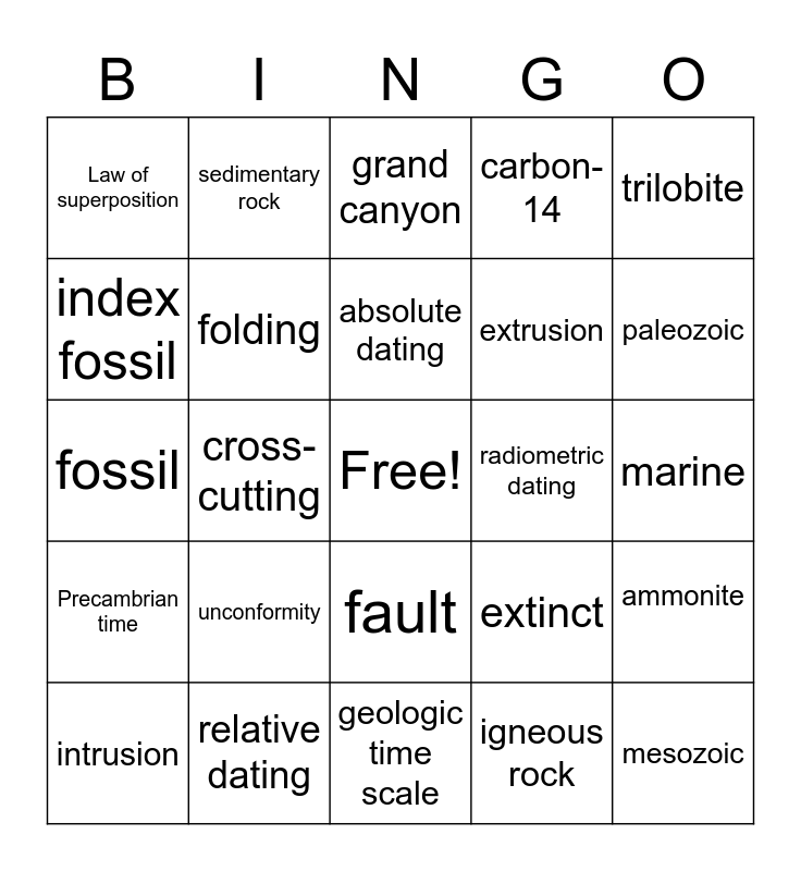 This bingo card has a free space and 24 words: unconformity, relative dating, absolute dating, intrusion, trilobite, Law of superposition, index fossil, sedimentary rock, radiometric dating, fault, extrusion, fossil, extinct, ammonite, folding, igneous rock, marine, grand canyon, paleozoic, cross-cutting, mesozoic, Precambrian time, carbon-14 and geologic time scale.
