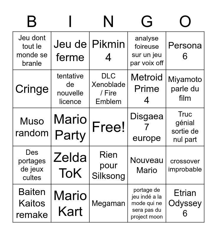 This bingo card has a free space and 24 words: Zelda ToK, Mario Kart, DLC Xenoblade / Fire Emblem, Baiten Kaitos remake, Persona 6, Jeu dont tout le monde se branle, Cringe, Jeu de ferme, Disgaea 7 europe, Rien pour Silksong, Metroid Prime 4, Muso random, Nouveau Mario, crossover improbable, tentative de nouvelle licence, portage de jeu indé a la mode qui ne sera pas du project moon, Truc génial sortie de nul part, Pikmin 4, Miyamoto parle du film, Mario Party, Etrian Odyssey 6, Des portages de jeux cultes, analyse foireuse sur un jeu par voix off and Megaman.