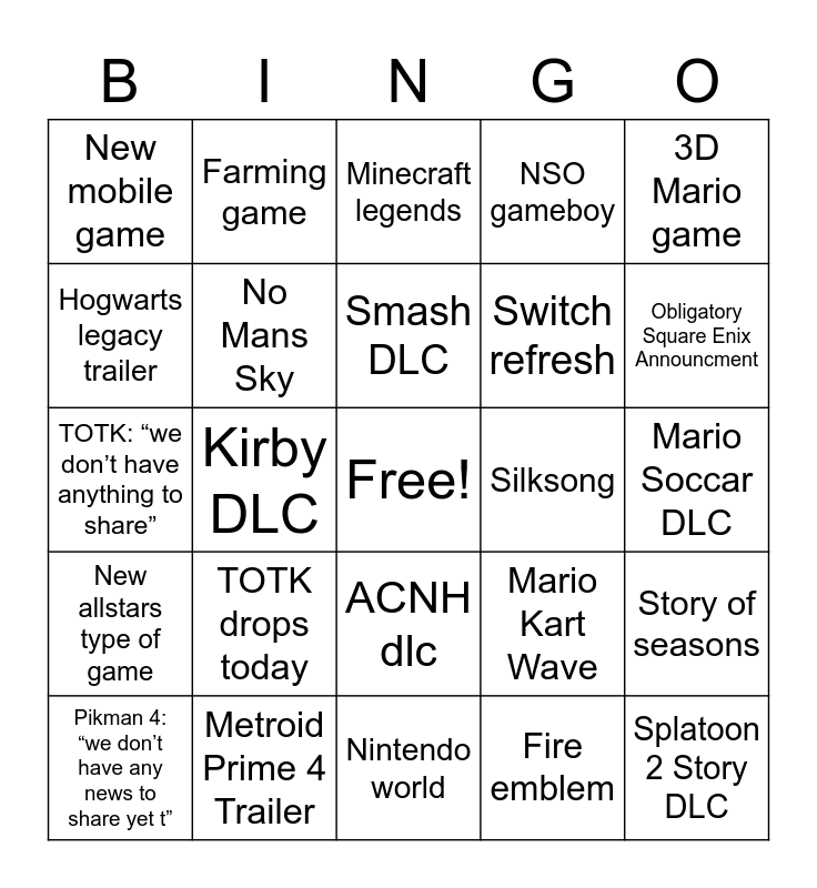 This bingo card has a free space and 24 words: TOTK drops today, Metroid Prime 4 Trailer, Smash DLC, Pikman 4: “we don’t have any news to share yet t”, 3D Mario game, New mobile game, Hogwarts legacy trailer, Farming game, Silksong, ACNH dlc, Switch refresh, TOTK: “we don’t have anything to share”, Mario Kart Wave, Story of seasons, No Mans Sky, Fire emblem, Mario Soccar DLC, Minecraft legends, Obligatory Square Enix Announcment, Kirby DLC, Splatoon 2 Story DLC, New allstars type of game, NSO gameboy and Nintendo world.