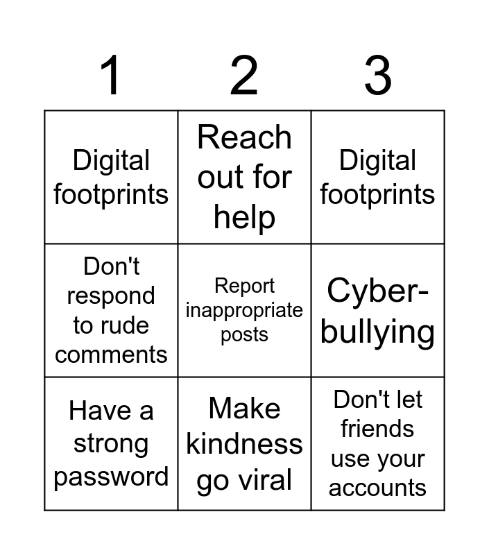 ⚠ This card has duplicate items: Always log out (2), Cyberspace (2), Make kindness go viral (2), Don't create fake accounts (2), Don't let friends use your accounts (2), Digital footprints (2), Cyber-bullying (2), Reach out for help (2)