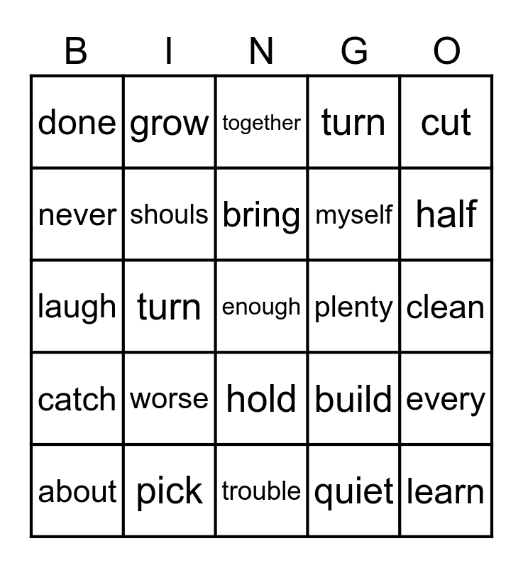 This bingo card has 30 words: about, better, bring, carry, cut, done, grow, hold, plenty, learn, catch, shouls, Free!, quiet, every, saw, turn, enough, build, half, laugh, pick, together, myself, clean, never, worse, trouble, turn and over.