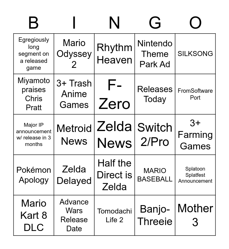 This bingo card has a free space and 24 words: Zelda Delayed, Advance Wars Release Date, F-Zero, Mario Kart 8 DLC, SILKSONG, Egregiously long segment on a released game, Miyamoto praises Chris Pratt, Mario Odyssey 2, Switch 2/Pro, Half the Direct is Zelda, Releases Today, Major IP announcement w/ release in 3 months, MARIO BASEBALL, Splatoon Splatfest Announcement, 3+ Trash Anime Games, Banjo-Threeie, 3+ Farming Games, Rhythm Heaven, FromSoftware Port, Metroid News, Mother 3, Pokémon Apology, Nintendo Theme Park Ad and Tomodachi Life 2.