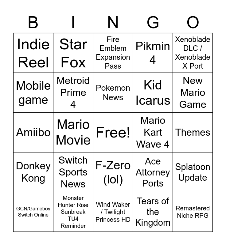 This bingo card has a free space and 24 words: Switch Sports News, Monster Hunter Rise Sunbreak TU4 Reminder, Pokemon News, GCN/Gameboy Switch Online, Xenoblade DLC / Xenoblade X Port, Indie Reel, Mobile game, Star Fox, Mario Kart Wave 4, F-Zero (lol), Kid Icarus, Amiibo, Ace Attorney Ports, Splatoon Update, Metroid Prime 4, Tears of the Kingdom, Themes, Fire Emblem Expansion Pass, New Mario Game, Mario Movie, Remastered Niche RPG, Donkey Kong, Pikmin 4 and Wind Waker / Twilight Princess HD.