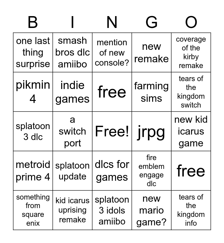 This bingo card has a free space and 24 words: splatoon update, kid icarus uprising remake, free, something from square enix, coverage of the kirby remake, one last thing surprise, pikmin 4, smash bros dlc amiibo, jrpg, dlcs for games, farming sims, splatoon 3 dlc, fire emblem engage dlc, free, indie games, new mario game?, new kid icarus game, mention of new console?, tears of the kingdom switch, a switch port, tears of the kingdom info, metroid prime 4, new remake and splatoon 3 idols amiibo.
