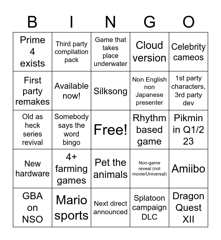 This bingo card has a free space and 24 words: 4+ farming games, Mario sports, Silksong, GBA on NSO, Celebrity cameos, Prime 4 exists, First party remakes, Third party compilation pack, Rhythm based game, Pet the animals, Non English non Japanese presenter, Old as heck series revival, Non-game reveal (not movie/Universal), Amiibo, Available now!, Splatoon campaign DLC, Pikmin in Q1/2 23, Game that takes place underwater, 1st party characters, 3rd party dev, Somebody says the word bingo, Dragon Quest XII, New hardware, Cloud version and Next direct announced.