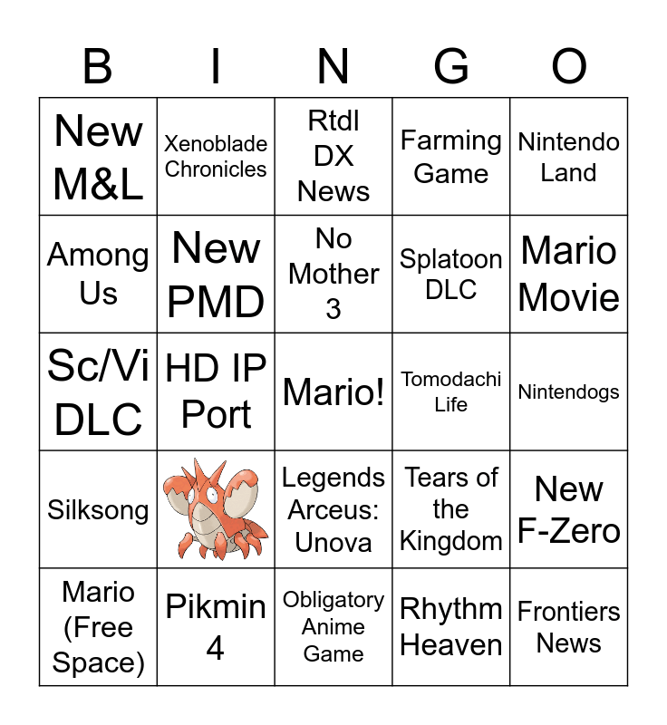 This bingo card has 1 images, a free space and 24 words: Obligatory Anime Game, No Mother 3, Mario (Free Space), Nintendo Land, New M&L, Among Us, Xenoblade Chronicles, Tomodachi Life, Legends Arceus: Unova, Splatoon DLC, Sc/Vi DLC, Tears of the Kingdom, New F-Zero, New PMD, Absolute Hype, Nintendogs, Rtdl DX News, Mario Movie, HD IP Port, Frontiers News, Pikmin 4, Silksong, Farming Game and Rhythm Heaven.