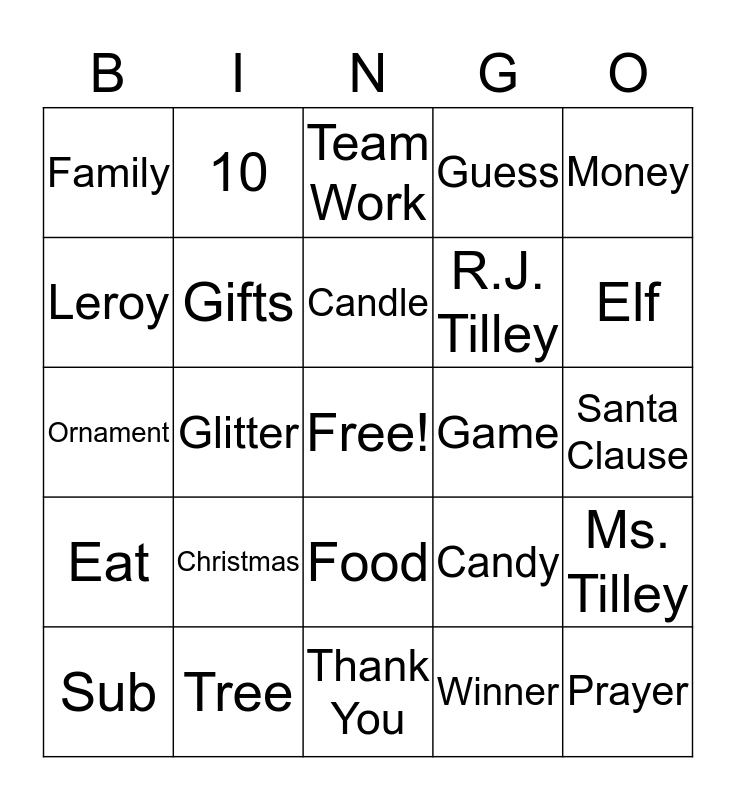This bingo card has a free space and 24 words: Christmas, Tree, Candle, Sub, Money, Family, Leroy, 10, Game, Food, R.J. Tilley, Ornament, Candy, Ms. Tilley, Gifts, Winner, Santa Clause, Team Work, Elf, Glitter, Prayer, Eat, Guess and Thank You.