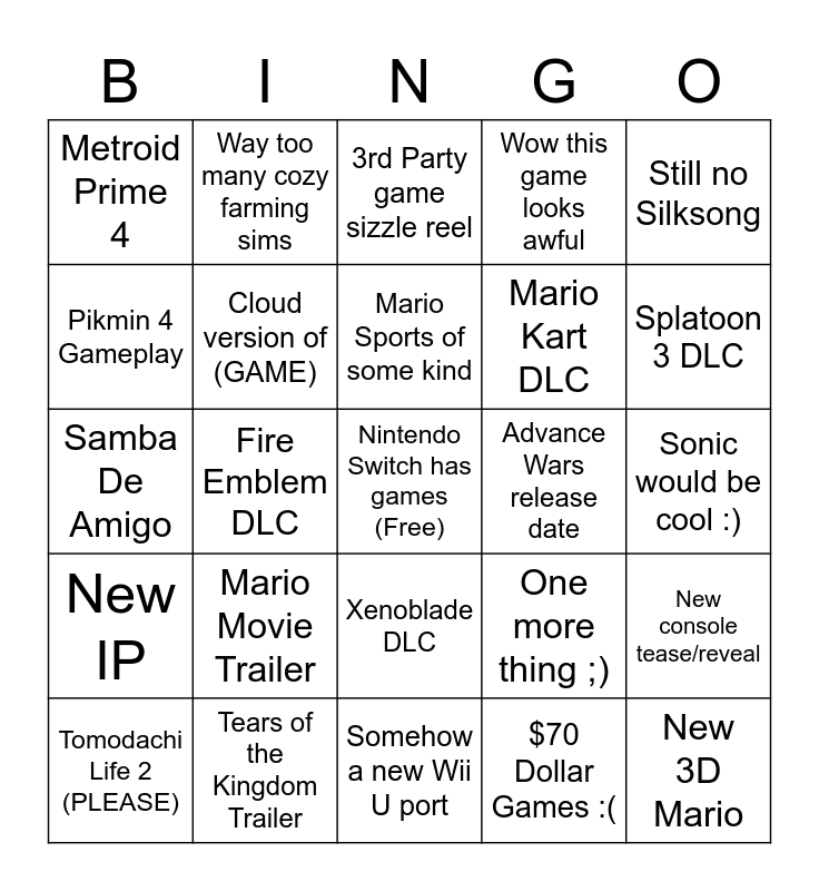 This bingo card has a free space and 24 words: Mario Movie Trailer, Tears of the Kingdom Trailer, Mario Sports of some kind, Tomodachi Life 2 (PLEASE), Still no Silksong, Metroid Prime 4, Pikmin 4 Gameplay, Way too many cozy farming sims, Advance Wars release date, Xenoblade DLC, Mario Kart DLC, Samba De Amigo, One more thing ;), New console tease/reveal, Cloud version of (GAME), $70 Dollar Games :(, Sonic would be cool :), 3rd Party game sizzle reel, Splatoon 3 DLC, Fire Emblem DLC, New 3D Mario, New IP, Wow this game looks awful and Somehow a new Wii U port.
