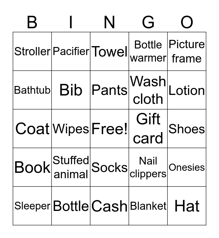 This bingo card has a free space and 30 words: Bottle, Diapers, Wipes, Spoons, Stroller, Towel, Bib, Socks, Gift card, Cash, Shoes, Hat, Blanket, Shampoo, Lotion, Diaper rash ointment, Nail clippers, Book, Stuffed animal, Picture frame, Coat, Toy, Pacifier, Wash cloth, Bathtub, Bottle warmer, Onesies, Sleeper, Pants and Gas drops.