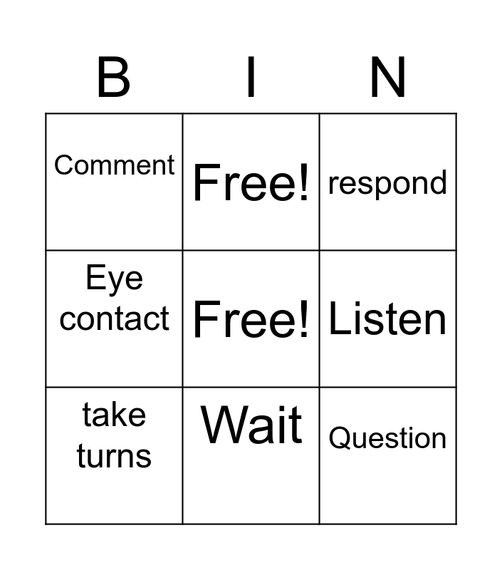 This bingo card has a free space and 8 words: Listen, respond, Free!, take turns, Comment, Question, Eye contact and Wait.