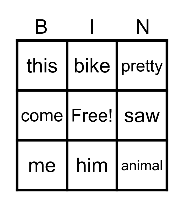 This bingo card has a free space and 8 words: saw, pretty, bike, me, this, animal, come and him.