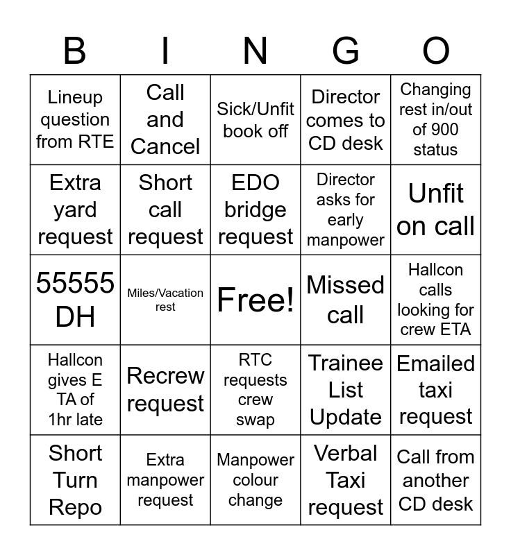 This bingo card has a free space and 24 words: Recrew request, Extra manpower request, EDO bridge request, Short Turn Repo, Changing rest in/out of 900 status, Lineup question from RTE, Extra yard request, Call and Cancel, Missed call, RTC requests crew swap, Director asks for early manpower, 55555 DH, Trainee List Update, Emailed taxi request, Short call request, Verbal Taxi request, Hallcon calls looking for crew ETA, Sick/Unfit book off, Unfit on call, Miles/Vacation rest, Call from another CD desk, Hallcon gives ETA of 1hr late, Director comes to CD desk and Manpower colour change.