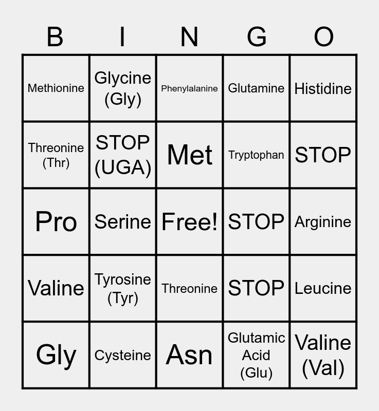 This bingo card has a free space and 70 words: Alanine, Arginine, Asparagine (Asn), Aspartic Acid (Asp), Cysteine, Glutamic Acid (Glu), Glutamine, Glycine, Histidine, Isoleucine, Leucine, Lysine, Methionine, Phenylalanine, Proline, Serine, Threonine, Tryptophan, Tyrosine, Valine, STOP, STOP, STOP, Alanine (Ala), Arginine (Arg), Asparagine (Asn), Aspartic Acid (Asp), Cysteine (Cys), Glutamic Acid (Glu), Glutamine (Gln), Glycine (Gly), Histidine (His), Isoleucine (Ile), Leucine (Leu), Lysine (Lys), Methionine (Met), Phenylalanine (Phe), Proline (Pro), Serine (Ser), Threonine (Thr), Tryptophan (Trp), Tyrosine (Tyr), Valine (Val), STOP (UAA), STOP (UAG), STOP (UGA), Gly, Glu, Asp, Ala, Val, Arg, Ser, Lys, Asn, Thr, Met, Ile, Gln, His, Pro, Leu, Trp, Cys, Tyr, Phe, STOP (UAA), STOP (UAG), STOP (UGA) and FREE!.