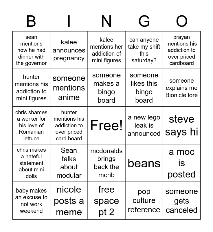 This bingo card has a free space and 24 words: Sean talks about modular, nicole posts a meme, someone makes a bingo board, baby makes an excuse to not work weekend, brayan mentions his addiction to over priced cardboard, sean mentions how he had dinner with the governor, hunter mentions his addiction to mini figures, kalee announces pregnancy, a new lego leak is announced, mcdonalds brings back the mcrib, someone likes this bingo board, chris shames a worker for his love of Romanian lettuce, beans, a moc is posted, someone mentions anime, pop culture reference, steve says hi, kalee mentions her addiction of mini figures, someone explains me Bionicle lore, hunter mentions his addiction to over priced card board, someone gets canceled, chris makes a hateful statement about mini dolls, can anyone take my shift this saturday? and free space pt 2.