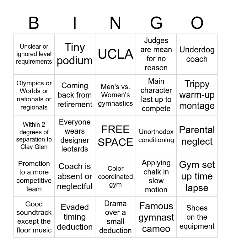 This bingo card has a free space and 39 words: Brief mention of rhythmic gymnastics, Climax of the movie is a floor routine, FIG dress code violation, Coming back from retirement, Good soundtrack except the floor music, Color coordinated gym, Men's vs. Women's gymnastics, Training in sports bras or street wear, Underdog coach, Promotion to a more competitive team, Everyone wears designer leotards, Judges are mean for no reason, Shoes on the equipment, Parental neglect, Unorthodox conditioning, Coach is absent or neglectful, Dramatic shot of a split jump, Unclear or ignored level requirements, Throwing a new skill to win a competition, Applying chalk in slow motion, Olympics or Worlds or nationals or regionals, Drama over a small deduction, Main character last up to compete, Trippy warm-up montage, Three person team, More than 3 close-up shots of feet, Orange juice, Little focus on vault, B-roll footage of giants, Tiny podium, Terrible floor/beam artistry, Treating rips like serious injuries, UCLA, Evaded timing deduction, Famous gymnast cameo, Being competitive is bad, Gym set up time lapse, Within 2 degrees of separation to Clay Glen and Physics defying injury.