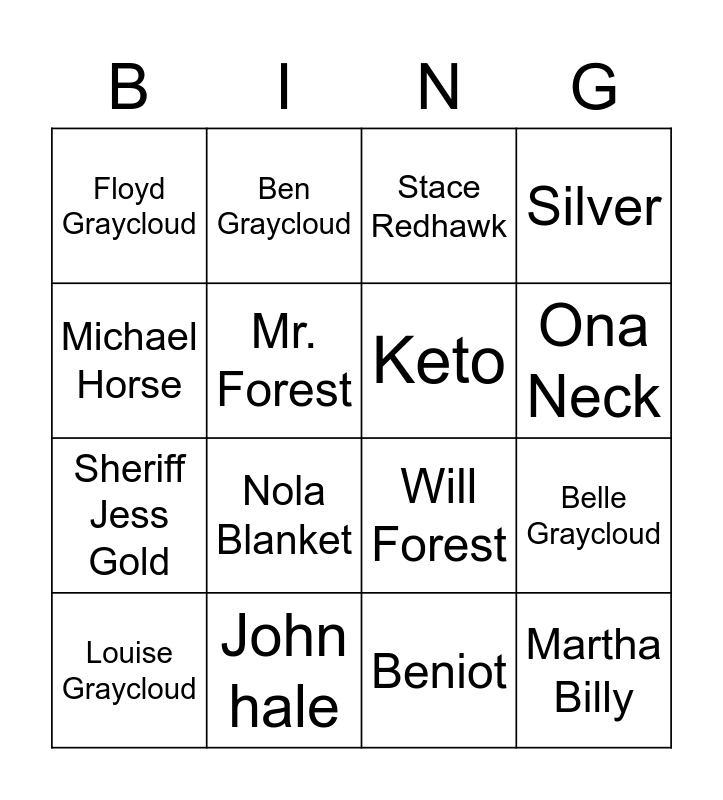 This bingo card has 20 words: Belle Graycloud, Moses Graycloud, Stace Redhawk, Lettie Graycloyd, Louise Graycloud, Michael Horse, John hale, Floyd Graycloud, Sheriff Jess Gold, Ben Graycloud, Nola Blanket, Will Forest, Mr. Forest, Martha Billy, Keto, John Stink, Ona Neck, Silver, Beniot and Grace Blanket.