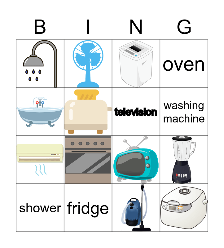 This bingo card has 12 images and 7 words: television, fridge, shower, blender, oven, washing machine and vacuum cleaner.