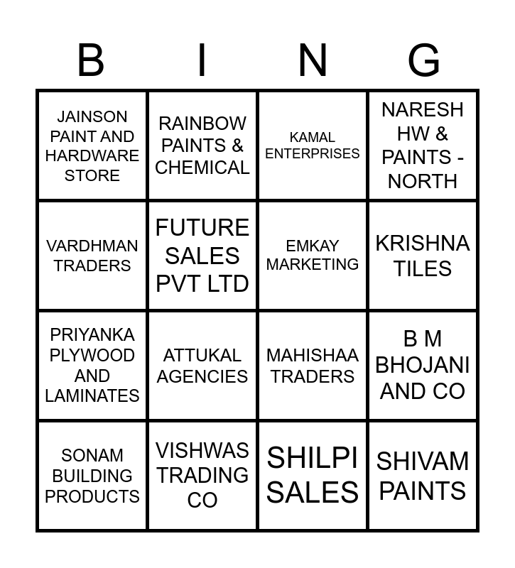 This bingo card has 197 words: Free!, BANSAL SALES CORPORATION, SHREE ASHAPURA AGENCY, GANPATI IMPEX, BALAJI LAMINATES AND PLYWOOD, GUPTA PLYWOOD, HARDWARE KHAZANA, CHETAN HARDWARE, PUNJAB PLYWOOD HOUSE, PRIYANKA PLYWOOD AND LAMINATES, ADHESIVES AND PACKAGING CO., BANSAL PAINT AND HARDWARE STORE, CLASSIC PLY N WOOD, DELUXE PLYWOOD, GURU NANAK IND, SWASTIK HARDWARE, INTER DCOR INCORPORATION CORP, KRISHIKA PAINTS AND SERVICES, SANJAY PLYWOOD, AMRIT TRADERS PVT. LTD., MOHIT ENTERPRISES, PARAS RAM SOM NATH, GOEL PAINT AND HARDWARE STORE, S.L.PAINTS AND CHEMICALS INDIA, INDRAJEET BROTHERS, ARAWALI TIMBER, SHIV SHANKAR ENTERPRISES, MAHAVIR GLASS AND HARDWARE, PRINCE PLY N VENEER, NILKANTH HARDWARE AND PLYWOOD, VENKATESHWARA INNOVATIONS, PLY GALLERY, URO VENEER WORLD, AYUSH PAINT AND HARDWARE, ANAND GLASS AND PLYWOOD STORES, BHAT TRADING COMPANY, BABA PAINT AND HARDWARE STORE, GIAN CHAND ASHOK KUMAR, DARWESH HARDWARE STORE, DELHI PAINT AND HARDWARE STORE, ANURAG TRADERS, PAWAN BUILDING MATERIAL STORE, GIRDHAR SINGH MEHTAB SINGH, GANGAR TIMBER, KRISHNA PAINTS & HARDWARE, EMKAY HARDWARE, JAINSON PAINT AND HARDWARE STORE, NOVELTY PAINTS HOUSE, MURTAZA PAINTS PVT.LTD., VARDHMAN TRADERS, NARESH HW & PAINTS - NORTH, MAHISHAA TRADERS, DUTTA SONS, MITTAL TRADERS, MUBARAK PAINTS, MD THAKKAR, MAJRA PAINTS PVT. LTD., SONAM BUILDING PRODUCTS, MADHAV TRADING COMPANY, POORNIMA ELECTRIC & HARDWARE, SRI AAI MATAJI AGENCIES, SILICOAT POLYMERS, SURABHI AGENCY, BAKKAH LEAK CLINC, VIJAY SHANTI SANITARYWARE & HARDWARE, AMBIKA HARDWARE AND ELECTRICALS, ARIHANT STEEL AND SANITATION, B M BHOJANI AND CO, GANESH HARDWARE AND SANITARY, FASHION PAINTS IRINJALAKUDA, KARTIK B CONTRACTER, NEW CHALAI AGENCIES, RAINBOW PAINTS & CHEMICAL, RASHTRIYA MARKETING PVT LTD, S D RANGWALA C P TANK, SRI SAI TRADERS, SHIVAM PAINTS, SREE KARTHIKEYAN HARDWARES, VIJAY GENERAL STORE, J K KALDA, SABHARWAL TRADING CO., MORBI TILES AND SANITARY DEPOT, SHALIMAR TRADING CO., SODHI MARBLE, KRISHNA TILES, LUKUSH MARBLE AND GRANITE, BANSAL CERAMICS, VARDAN ENTERPRISE, ELEGANCE, KRISHNA CERAMIC, ATTUKAL AGENCIES, KJ GRANITES, NEW WHITE MARBLE HOUSE, PAPPU ELECTRICAL, MATAJI PAINTS AND HARDWARE, SAI OM SANITARYWARE, HI DESIGN, SHREE SHYAM CERAMIC, PLUS ENTERPRISE, PLATINUM ENTERPRISE, VANITHA ENTERPRISE, STONE WORLD, BALAJI TRADING COMPANY, MAHESH AND CO, MAYUR SALES CORPORATION, MADAN SHREE TRADERS, JAY CHAMUNDA HARDWARE & SANITARY, RAJDHANI MOSAIC, SHAH SALES CORPORATION, SHREE UMIYA SALES AGENCY, SAINI MINES AND MARBLES, VEERA AGENCY, YOGI HARDWARE, SUN AGENCY, EXPERT BUILDING SOLUTION, GARG ENTERPRISE, OM BUILDING MATERIAL, KGM TRADERS, SONA CERAMICS, AKRUTI CERAMICS, NATURO PROTECT, RADIANT EXIM INDIA, MSP ENTERPRISES, ELORA BUILDCARE, BUILDWELL, AHUJA PLYWOOD, MAA LUXMI TRADING COMPANY, VISHVKARMA PLYWOOD, VIJAY BOOK DEPOT, ADT INDUSTRIES, KANHAIYA ENTERPRISE, RAHUL AGENCIES, JAI SHREE RADHEY SHYAM ENTERPRISES, SHILPI SALES, H B POLYTECH, EMPIRE ENTERPRISES, AADHAR STEEL TRADERS, CURE TECH CIVIL SERVICES, COMPLETE WATERPROOFING SOLUTIONS, BUILDCARE SYSTEM, B R TRADERS, WELCOME COLOURS AND CHEMICALS, VINOD TRADING CO., AGARWAL TRADERS, FUTURE SALES PVT LTD, CONSTRO CHEM, GOWRI AGENCIES, VEDANT MARKETING, NAVBHARAT TRADING CORPORATION, ANALCO INDIA PVT.LTD., R.P. ENTERPRISES, ACROPOLISH MARKETING, HARINARAYAN HEMCHANDRA, ROHIT ENTERPRISES NEHRUNAGAR, SANDEEP AND CO, SUPER CONSTRUCTION CHEMICALS, SAIFEE WATER PROOFING CO., DHARTI ENTERPRISES, PREMIER AGENCIES, GURU KIRPA AUTO AGENCY, HAFIZ BROTHERS, HERO PAINTS, JAIN CEMENT AND IRON TRADERS, JEEVAN HARDWARE, KAMAL ENTERPRISES, RAHEEQ GROUP, NJAVALLIKUNNEL PAINTS, K K AGENCY, MANGAL AGENCIES PVT. LTD., METRO TUBING CO, LADHA SINGH KASHMIRA SINGH, GIRDHAR SINGH SURINDER PAL SINGH, GARG MILL STORE AND AUTOS, R. R. B SALES, SURAJ BHAN RAM BILAS, M/S SURESH AND CO., SHRADDHA HARDWARE, EASY LIFE MARKETING, PUNJAB PLY EMPORIUM, NILKAMAL MUKHERJEE AND SONS, S G PLYWOOD, SHRI SAI PLY HOME, JALARAM TIMBER CO., N.MANI AND SON, JINDAL CHEMICAL, YAHIA STORE, K.R.G. AND CO, SUGNAMAL AND SONS, EMKAY MARKETING, CAPITAL COLOUR, ROHINI PLY AND LAMINATES HOUSE, K.L.ABDUL SATHAR TECHNIQUES, NILESH TIMBER TRADERS, SWASTIK PLYWOOD AND VENEERS SD, SHRI RAM PLYWOOD NARELA, VISHWAS TRADING CO and SRI VIJAYA PLYWOOD PVT. LTD..