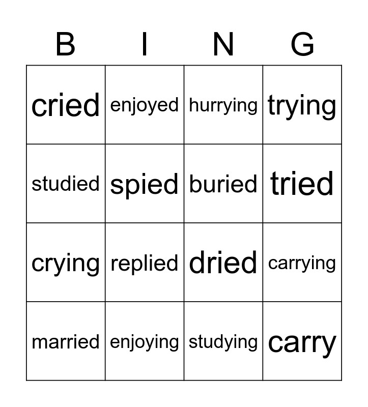 This bingo card has 19 words: dried, hurried, hurrying, carry, carrying, studied, studying, cried, enjoyed, crying, replied, spied, buried, enjoying, married, worried, trying, tried and worrying.