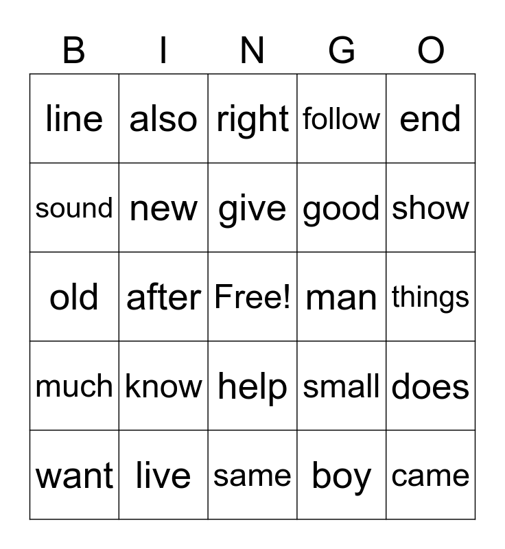 This bingo card has a free space and 59 words: over, live, name, much, boy, set, new, me, good, before, follow, put, sound, back, sentence, line, came, end, take, give, man, right, want, does, only, most, think, too, show, another, little, very, say, means, also, well, work, after, great, old, around, know, things, well, any, form, place, our, help, same, three, years, just, through, tell, small, sleep, upon and different.