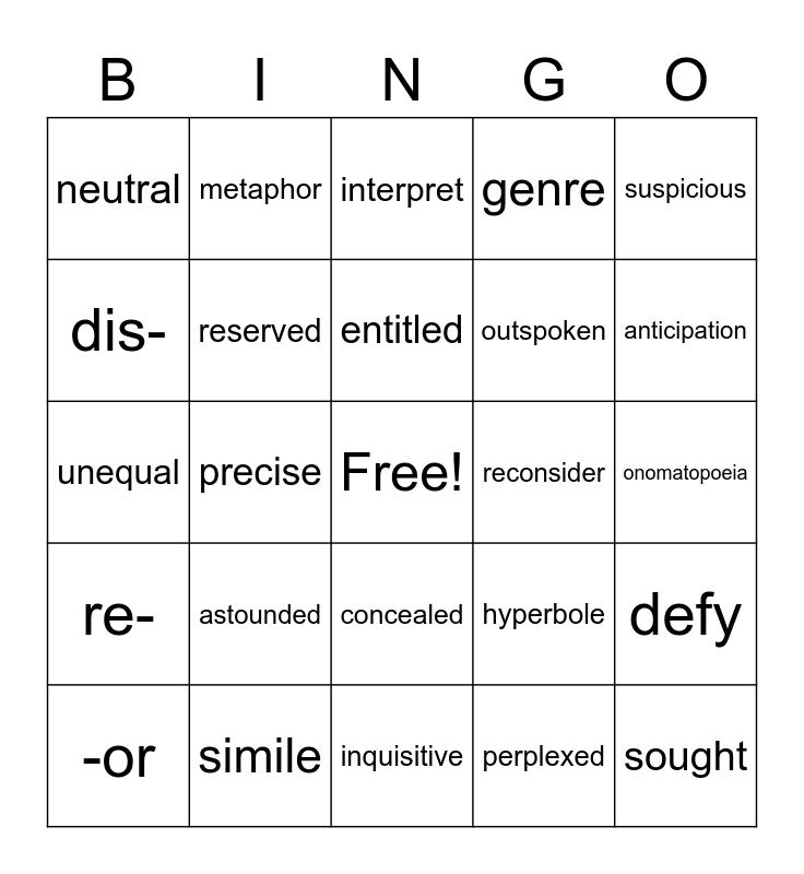 This bingo card has a free space and 24 words: astounded, simile, entitled, -or, suspicious, neutral, dis-, metaphor, reconsider, concealed, outspoken, unequal, hyperbole, defy, reserved, perplexed, onomatopoeia, interpret, anticipation, precise, sought, re-, genre and inquisitive.