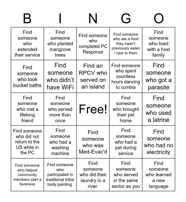 This bingo card has a free space and 31 words: Find someone who did their laundry in a river., Find an evacuee, Find someone who served more than once, Find someone who applied for PC service more than once, Find someone who extended their service, Find someone who completed PC Response, Find someone who didn’t have WiFi, Find someone who had a pet during service, Find someone who brought their pet home, Find someone who served in the same sector as you, Find someone who used a latrine, Find someone who learned a new language, Find someone who still keeps in touch with their community, Find someone who met their spouse or significant other during service, Find someone who got a parasite, Find someone who lived in a mud house, Find someone who had no electricity, Find someone who had a washing machine, Find someone who did not return to the US while in the PC, Find someone who was Med-Evac'd, Find someone who lived with a host family, Find someone who has been back to visit their village., Find someone who helped community members start a business, Find someone who planted mangrove trees, Find someone who spent countless hours dancing to cumbia, Find someone who took bucket baths, Find someone who ate a food they hadn't previously eaten / new to them, Find someone who met a lifelong friend, Find someone who participated in traditional tribal body painting., Find an RPCV who served on an island and Find someone who maintained a blog while serving.