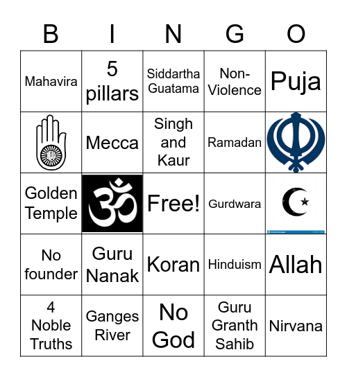 This bingo card has 4 images, a free space and 20 words: Guru Nanak, Ganges River, Singh and Kaur, 4 Noble Truths, Puja, Mahavira, 5 pillars, Gurdwara, Koran, Ramadan, Golden Temple, Hinduism, Allah, Mecca, Guru Granth Sahib, Siddartha Guatama, Nirvana, No founder, Non-Violence and No God.
